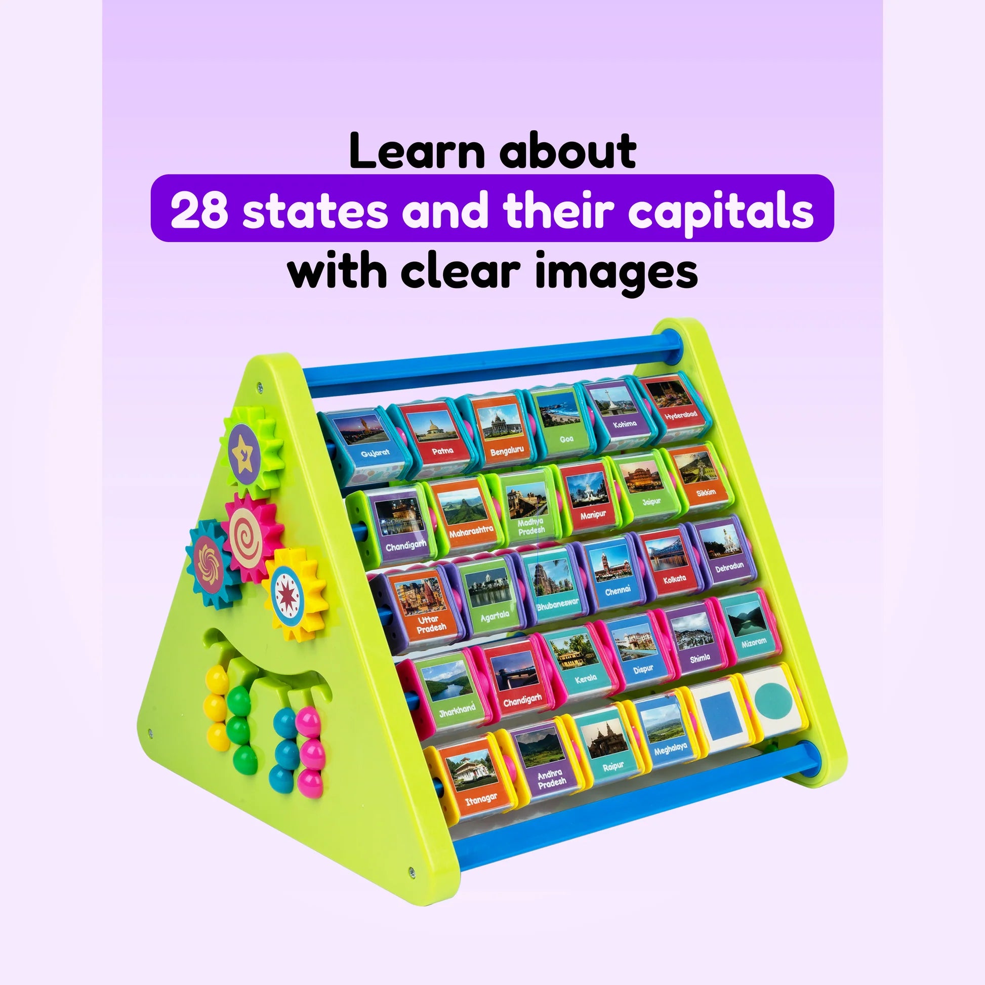 - Early Learning Through Play - Discover English alphabet, Tamil letters, States and capitals of India, numbers, shapes, colors, and textures through the interactive Triangle toy that instill a love for learning.